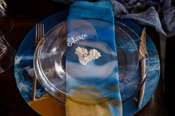 И вот возникло море, сотканное из сетки-рабицы и кусочков автомобильной пленки, маникюрного "битого стекла", канцелярских папок, а также из титанического и упорного труда самой невесты. И подобрались дрифтвудовые коряги, напоминавшие по силуэтам китов и акул, нашлись кораллы и морские желуди, а главной изюминкой стали отрастившие щупальца морские ежи, парившие в колбах, - все это как бы плыло в течении воздушной ткани, струящейся по дереву гостевого стола. Хотя самым потрясающим кусочком оформления банкета стали расписанные невестой подставки под тарелки и уникальные салфетки для каждого гостя, они были дополнены прозрачными тарелками и прозрачными же круглыми рассадочными карточками, "застрявшими" в кораллах.
