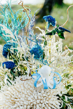 Пригласительный "озаглавил" символ и талисман пары - силуэт китовой акулы, шкатулкой для украшений послужила двустворчатая ракушка, кольце-держателем выступил осьминог, а букет напоминал кракен, - и все это только малая часть "придумок" для уникального торжества.