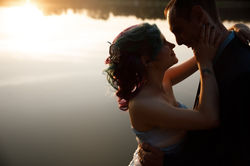 У невесты было необычное свадебное платье, где голубое омбре переходило в кипельно белый, ткань шла волнами-полосочками ассиметрично, но очень гармонично через весь верх, изящнейшая отделка была выполнена белыми пайетками и напоминала чешую. К нему также был создан пристяжной "хвост" шлейф, нижний слой юбки мерцал вышивкой крошечными кругляшками с люрексом сквозь верхний слой фатина, выглядело это все как самое настоящее волшебство. Букет Алёна тоже пожелала необычный: по форме он напоминал чудище кракена - ракушка наутилус, выпустившая щупальца. Эдакий новый домашний питомец. Во время свадьбы невеста нежно поглаживала его кончиками пальцев. Маникюр, конечно, тоже был в стилистике - рисунок из чешуек переливался разными цветами на солнышке. На этом сюрпризы в образе невесты не закончились: изумрудно-лиловые пряди прически , от которой, собственно, пошли все идеи по образу, дополняла заколка-осьминог. А на ушки были изготовлены специально под заказ асимметричные каффы с капельками бусинок, завитками волн, причудливыми изгибами и формами.