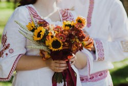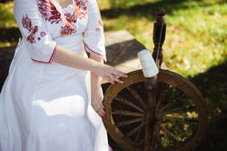 Шилась на заказ косоворотка и плелся к ней кушак, подбирались льняные штаны и (почти лапти!) мокасины для образа жениха. Создавалось восхитительное платье с рисунком в виде жар-птицы для невесты. Ее образ дополняли очелье, серьги и кокетливая маленькая сумочка с узором в тему.