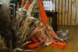 Для родных и близких пары были приготовлены разные сюрпризы на фуршет: они плели себе и молодым красивый оберег - славянский символ солнца, писали на тарелках, заготовленных для битья, антипожелания для новой семьи, угощались чаем из самовара, тискали местных недавно народившихся котят.