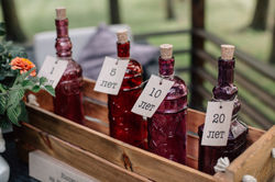 На тарелках гостей вместо рассадочных карточек появились спелые гранаты и инжир, виноград дополнил яркие флористические композиции. Сочный алый цвет подчеркнул изысканный дымчато-серый оттенок скатертей. В качестве подарков для гостей мы подготовили бутылочки с любимым напитком Кати – Миртом, который также контрабандой был ввезен из Италии.